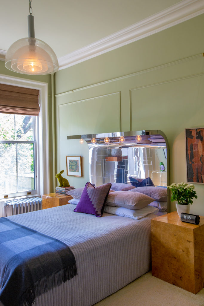 The 1970s-themed guest bedroom features a sexy, illuminated Paul Evans Cityscape headboard, 1970s, and Milo Baughman side tables, c. 1970s, under a Pulegoso pendant by Carlo Nason for Mazzega, c. 1970s.